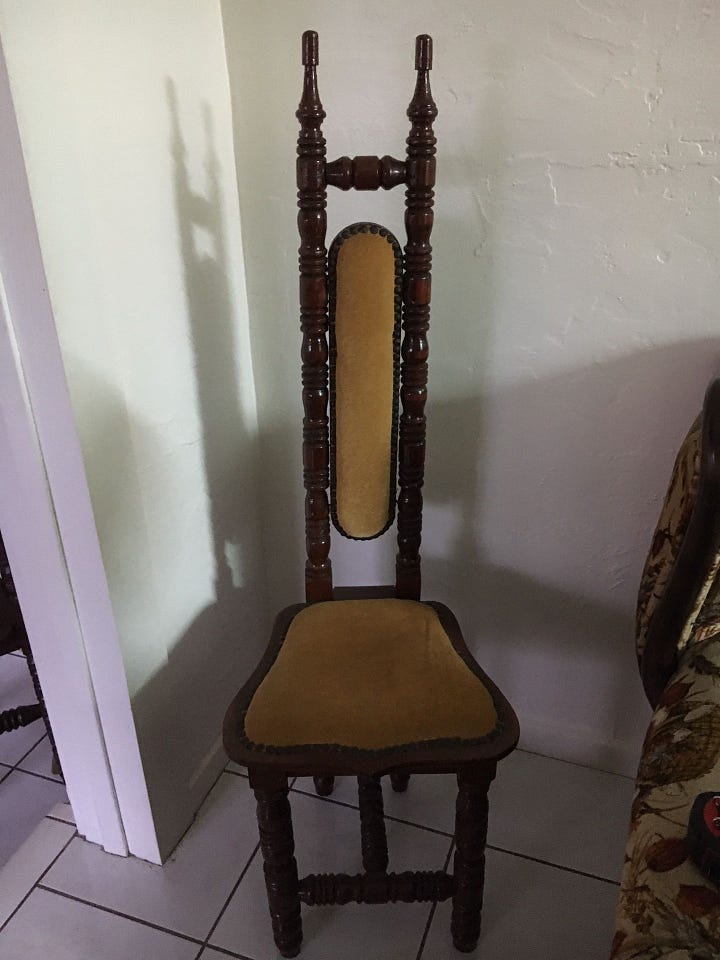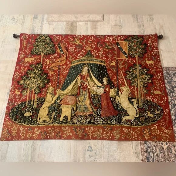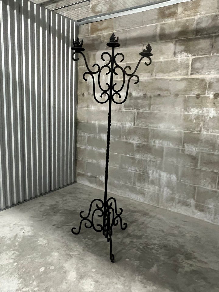 Clockwise, starting with top left: Pair of Prayer Chairs, $100; Antique Church Pew, $250; 6ft Tall Wrought Iron Candelabra, $150; 67”x50” Medieval Mon Seul Desir Tapestry, $222