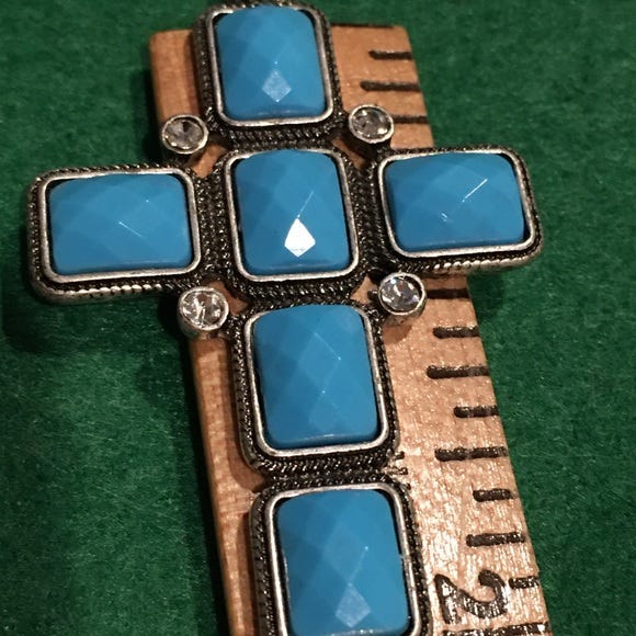 Clockwise, starting with top left: Vintage Avon Bracelet, $16; Vintage Avon Cabochon Cross Necklace, $37; Avon Turquoise Cross Necklace, $18; Vintage Brass Belt, $48