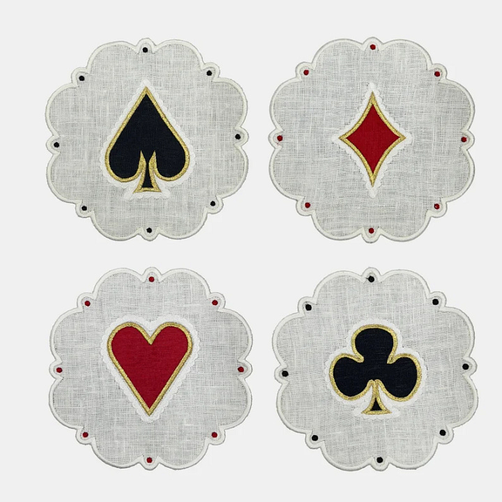 Clockwise, starting with top left: Set of 4 glasses, $30 ; Set of 4 Cocktail Napkins, $32; Set of 4 low cocktail glasses, $49; Set of 6 glass swizzle sticks; $50